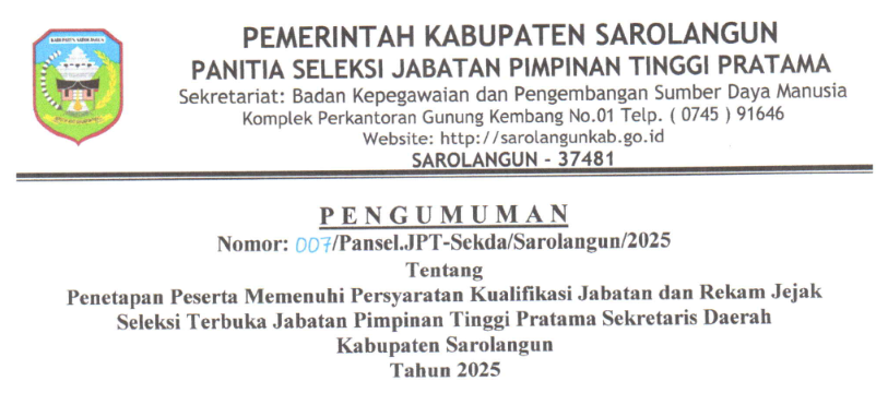 PENGUMUMAN Nomor : 007/Pansel.JPT-Sekda/Sarolangun/2025